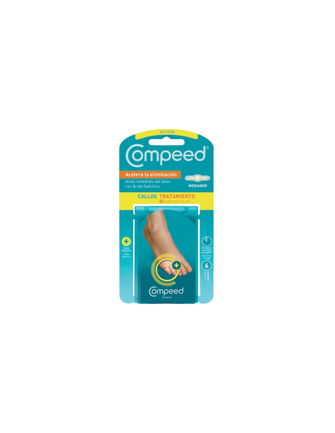 COMPEED® Callos Medianos no es un apósito normal y corriente. Su avanzada tecnología hidrocoloide está diseñada para aliviar el dolor al instante y evitar la fricción, a la vez que hidrata y suaviza el callo favoreciendo su eliminación. El ácido salicílico ayuda a eliminar la piel muerta que forma el callo, acelerando por lo tanto el proceso curativo.